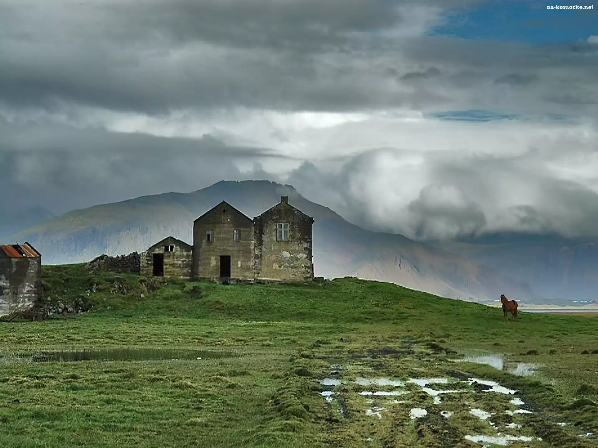 dom, Góry, Chmura, Niebo, koń na Komórkę