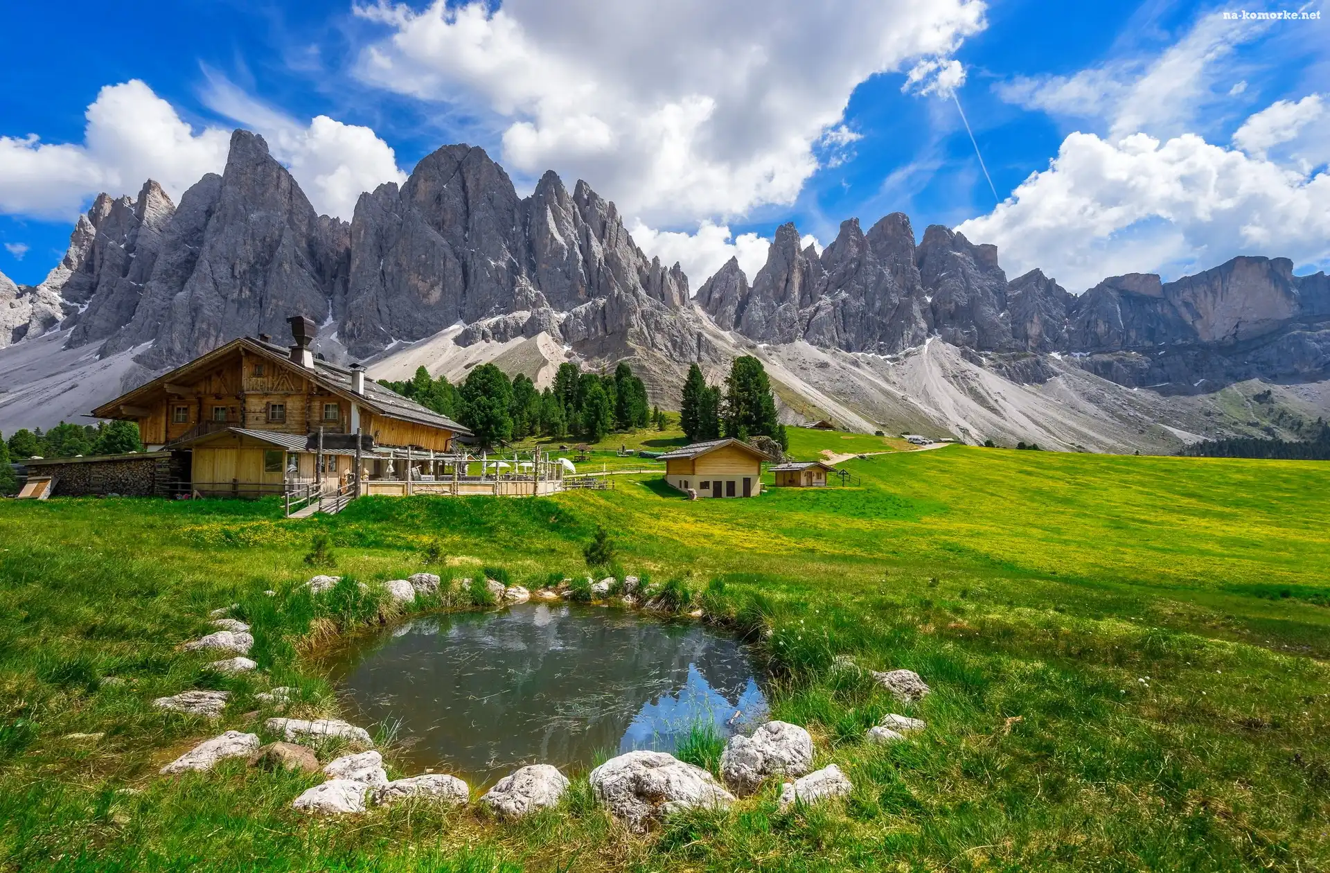 Włochy, Chmury, Drzewa, Dolomity, Park krajobrazowy Puez Odle, Góry, Dom na Komórkę