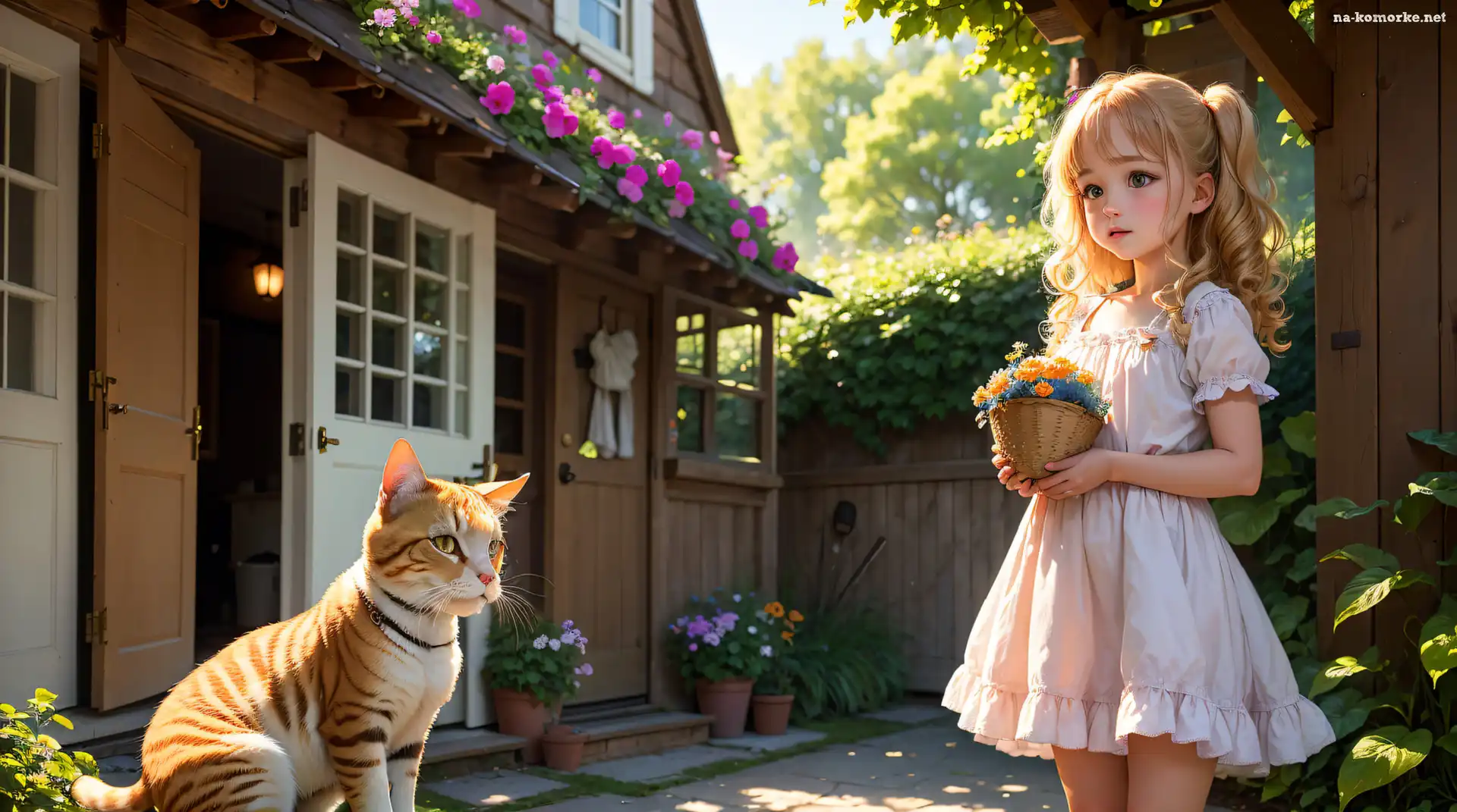 Dziewczynka, Dom, Podwórko, Kot, Grafika na Komórkę