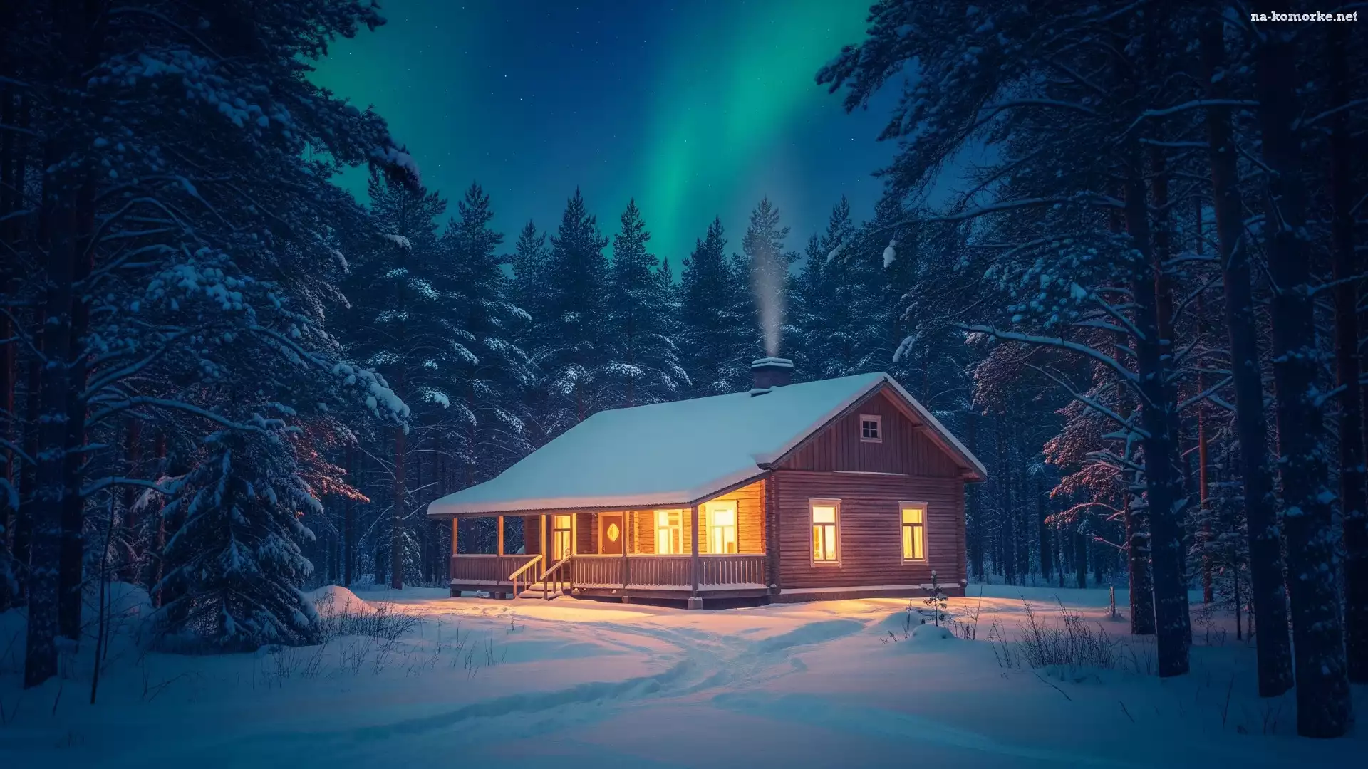 Zima, Drzewa, Las, Dom, Zorza polarna na Komórkę