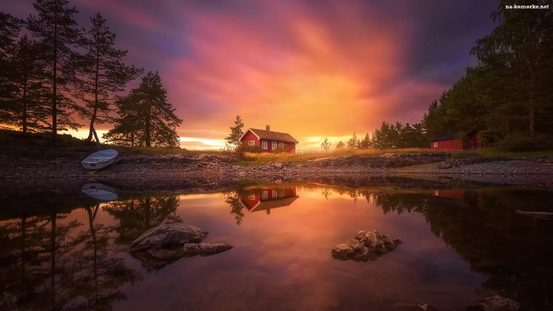 Norwegia, Dom, Łódka, Ringerike, Drzewa, Jezioro, Wschód słońca na Komórkę