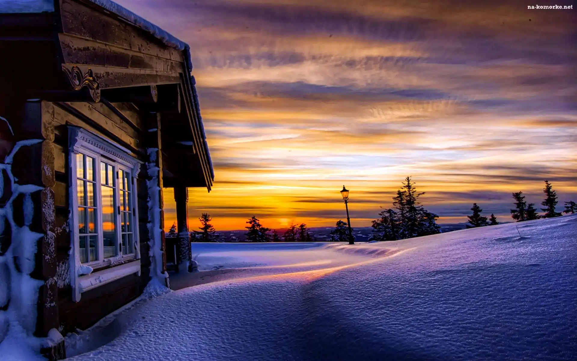 Dom, Zima, Śnieg, Wschód, Słońca na Komórkę