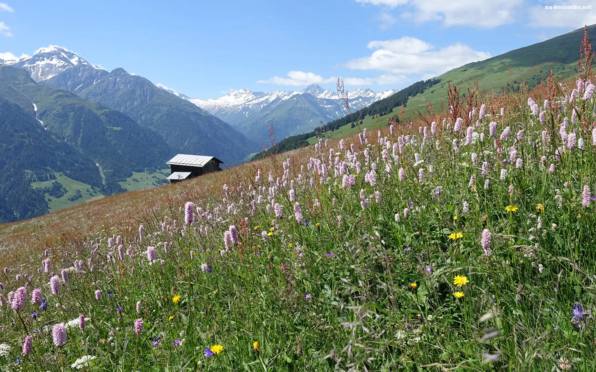 Domek, Góry, Wzgórze, Kwiaty, Łąka na Komórkę