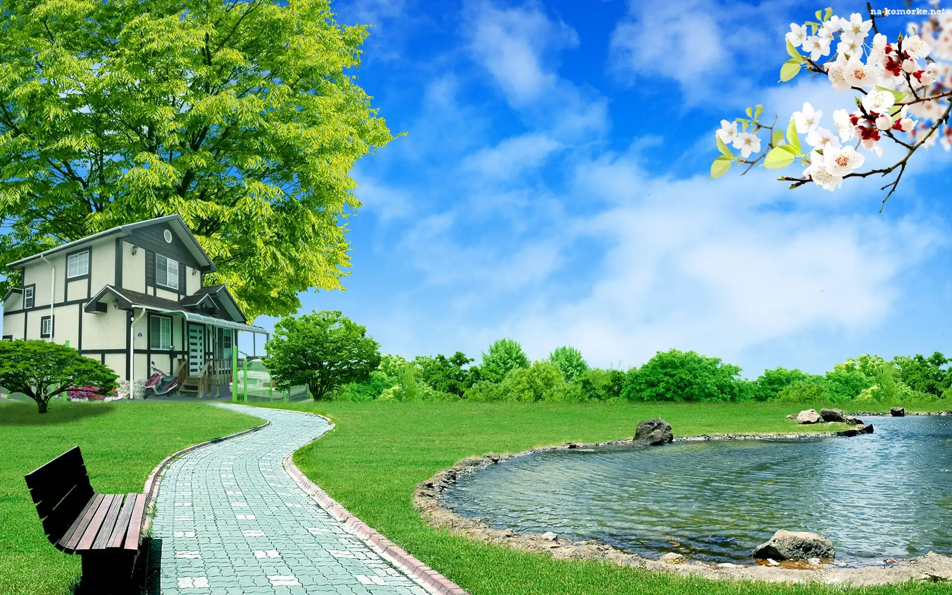 Domek, Drzewo, Ławka, Oczko, Wodne na Komórkę