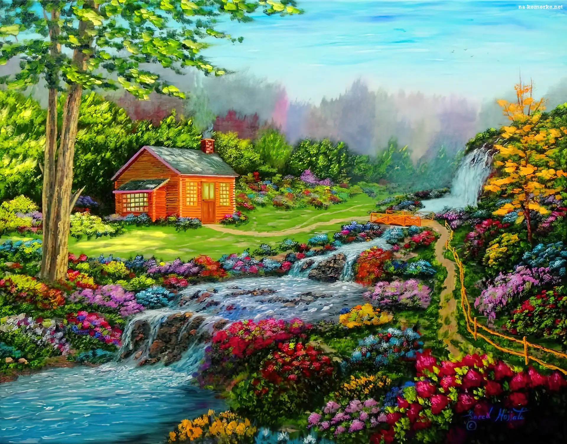Domek, Góry, Rzeka, Kwiaty na Komórkę