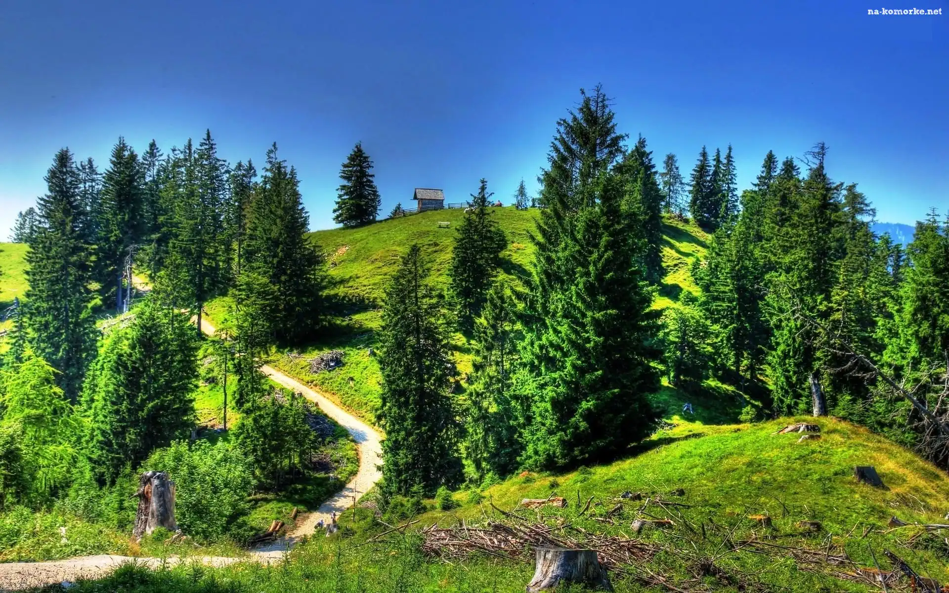 Domek, Droga, Wzgórze, Drzewa na Komórkę