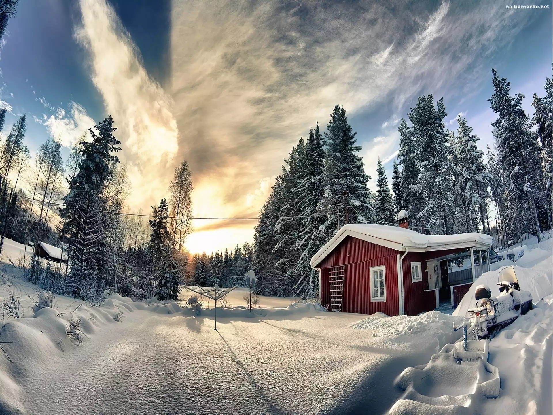 Domek, Zima, Las, Zachód, Słońca na Komórkę