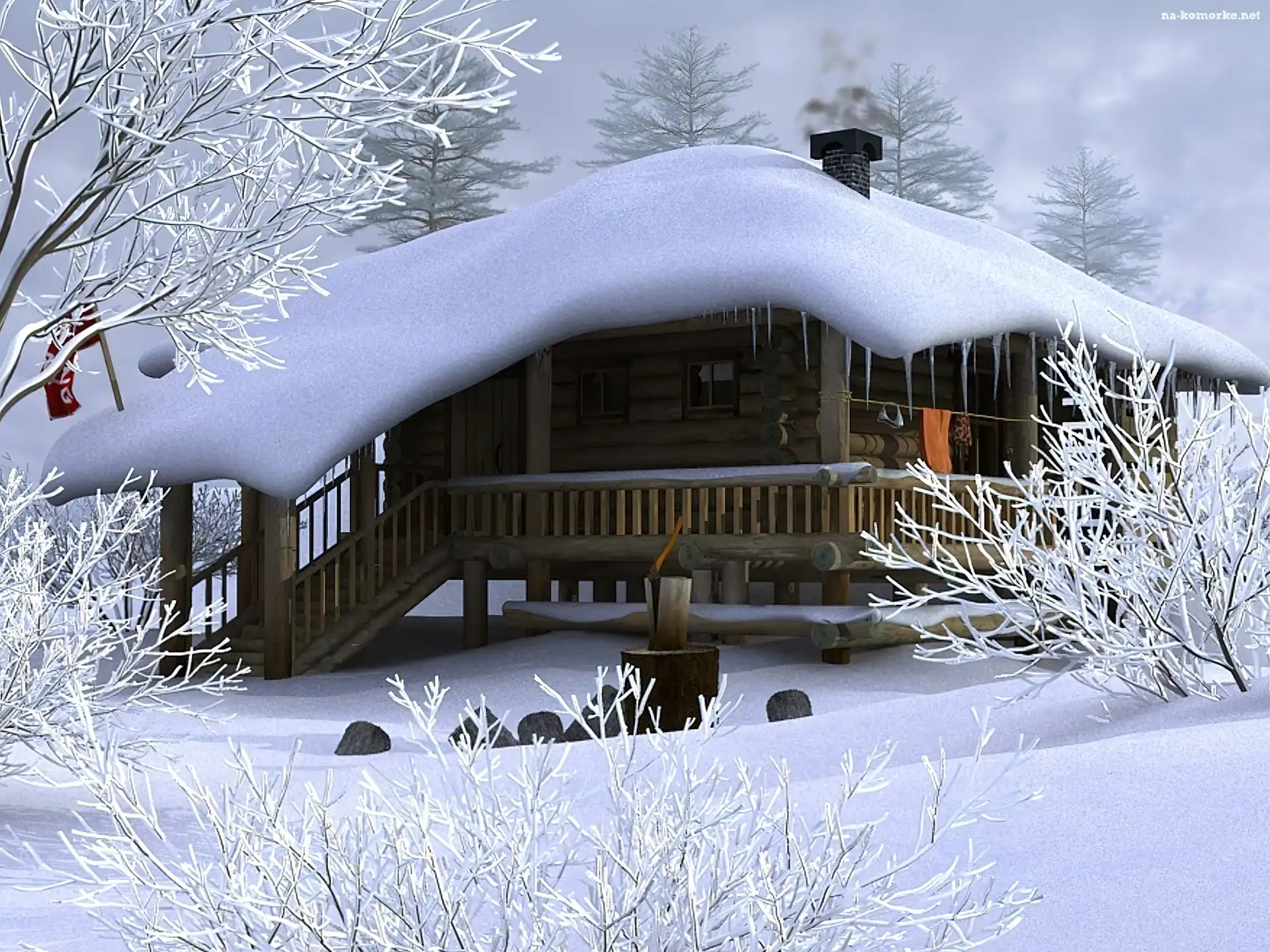 Domek, Drzewka, Zima, Śnieg na Komórkę