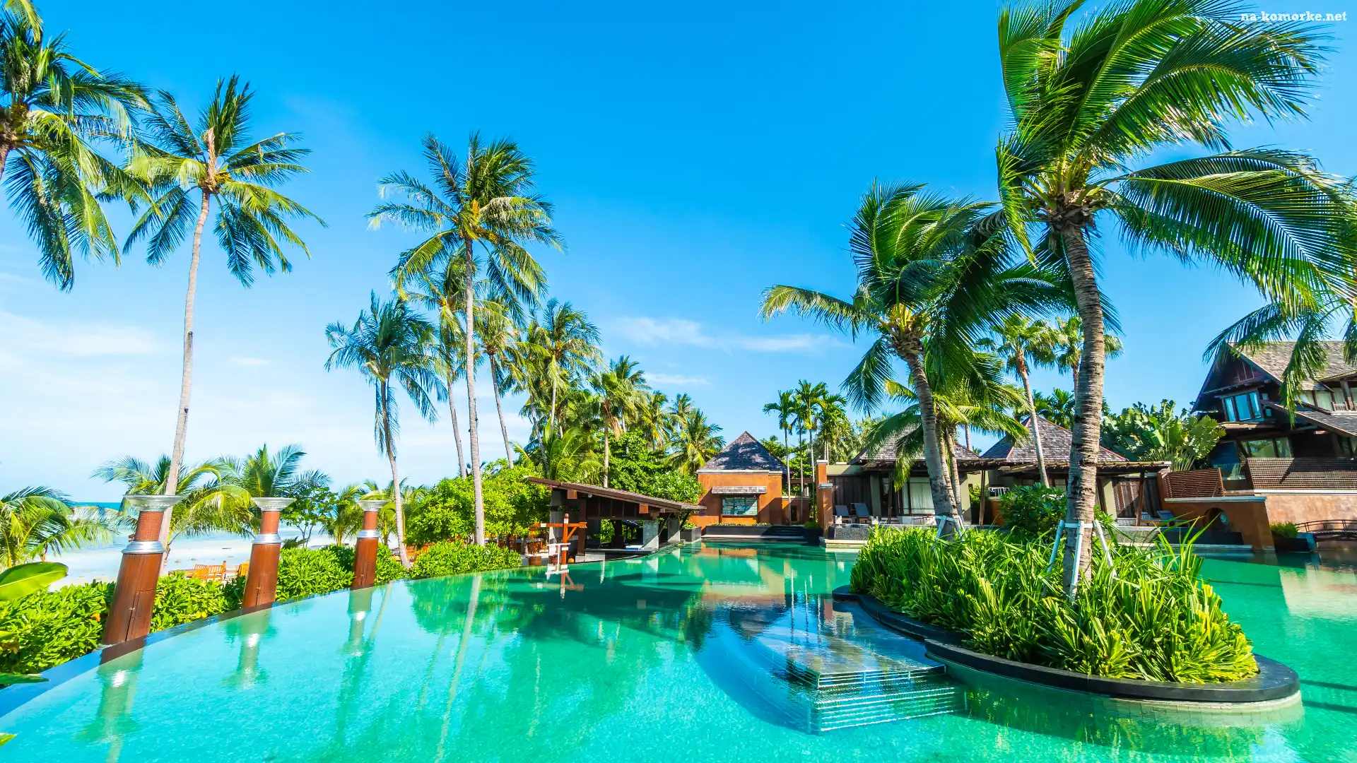 Domki, Roślinność, Wakacje, Palmy, Odkryty, Lato, Ogród, Drzewa, Basen, Niebo na Komórkę