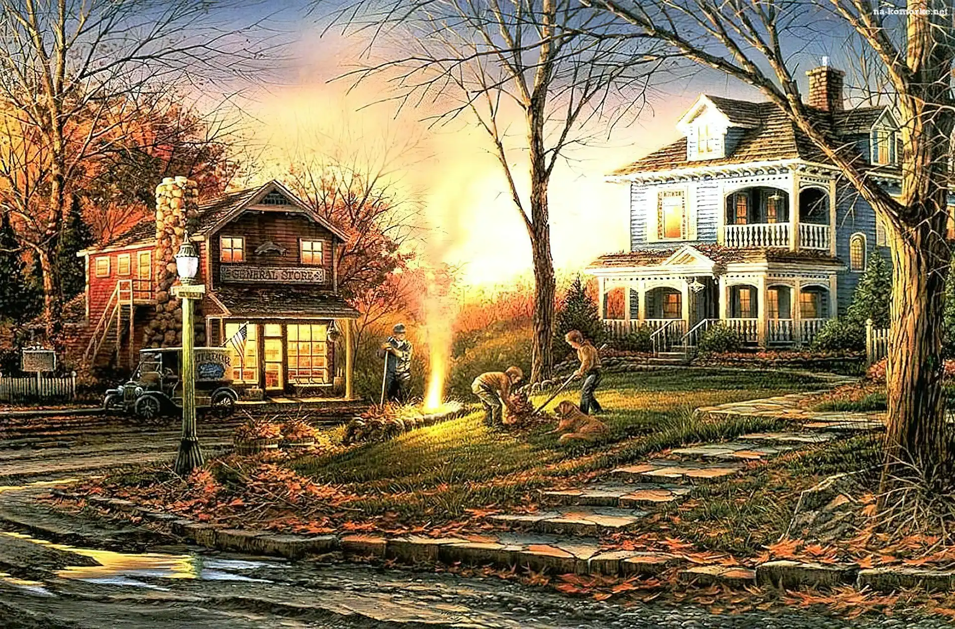 Domki, Malarstwo, Jesień, Widoczek na Komórkę