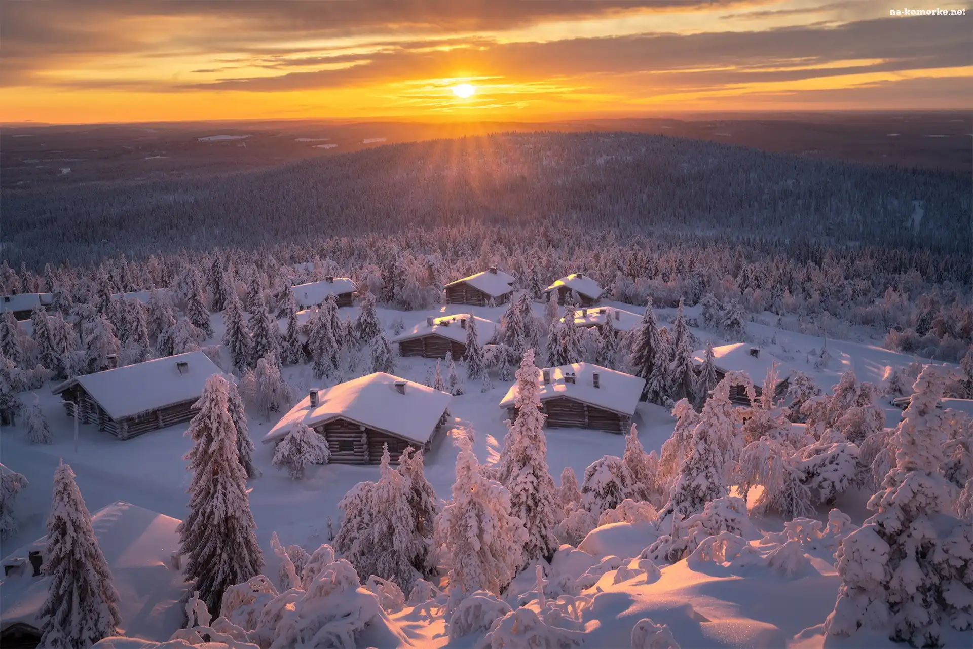 Zima, Zachód słońca, Lasy, Finlandia, Góry, Ośnieżone, Drzewa, Domki na Komórkę