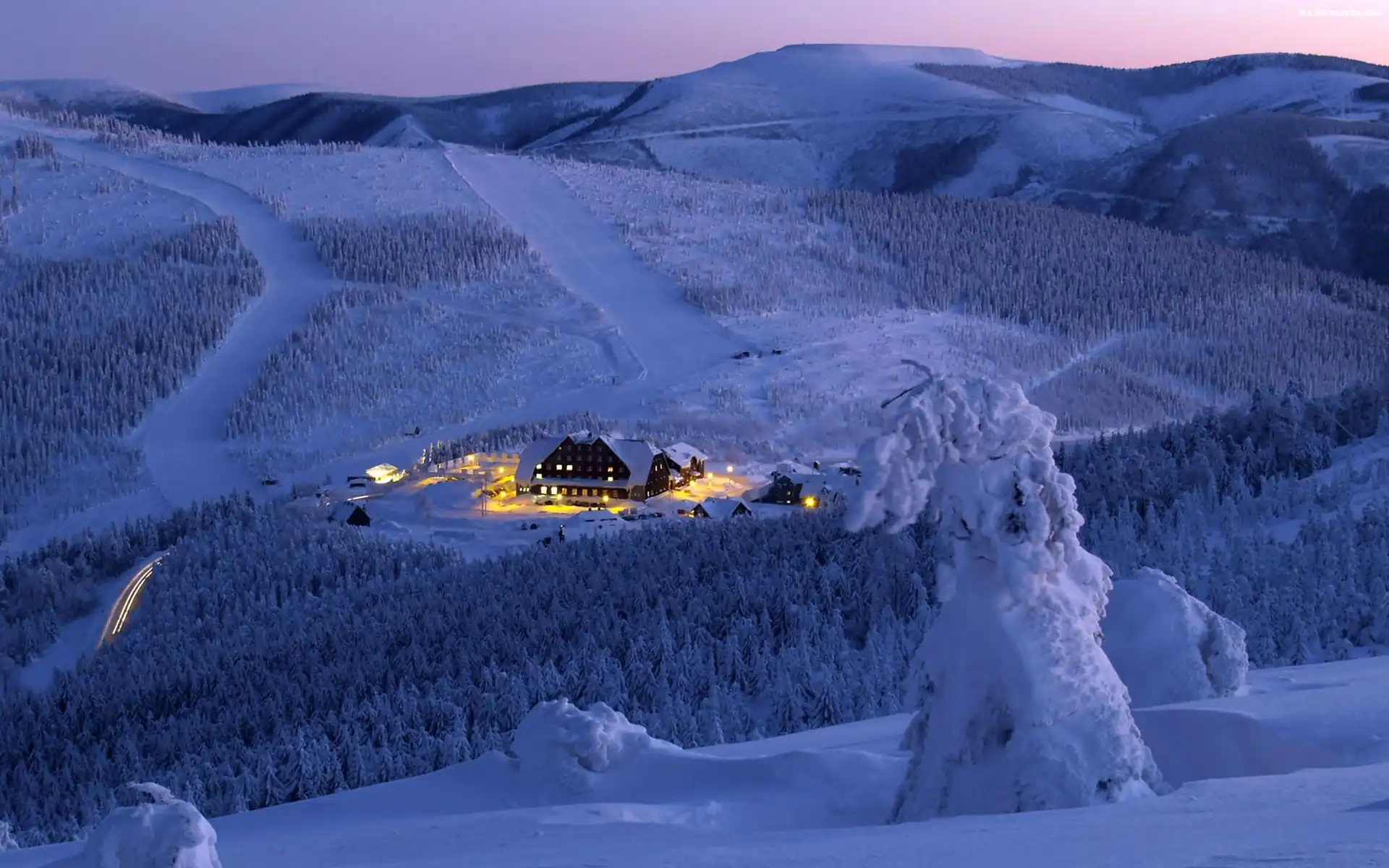 Domki, Zima, Góry, Zaśnieżone, Lasy na Komórkę