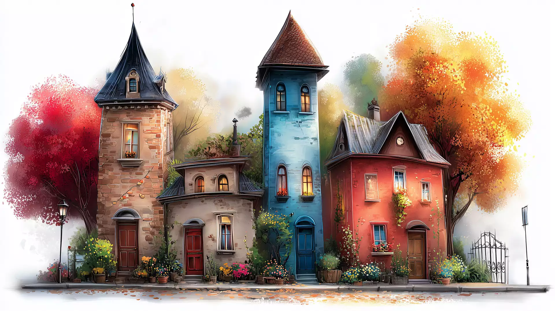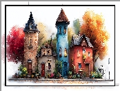 Kolorowe, Kwiaty, Drzewa, Domy, Grafika AI na Komórkę