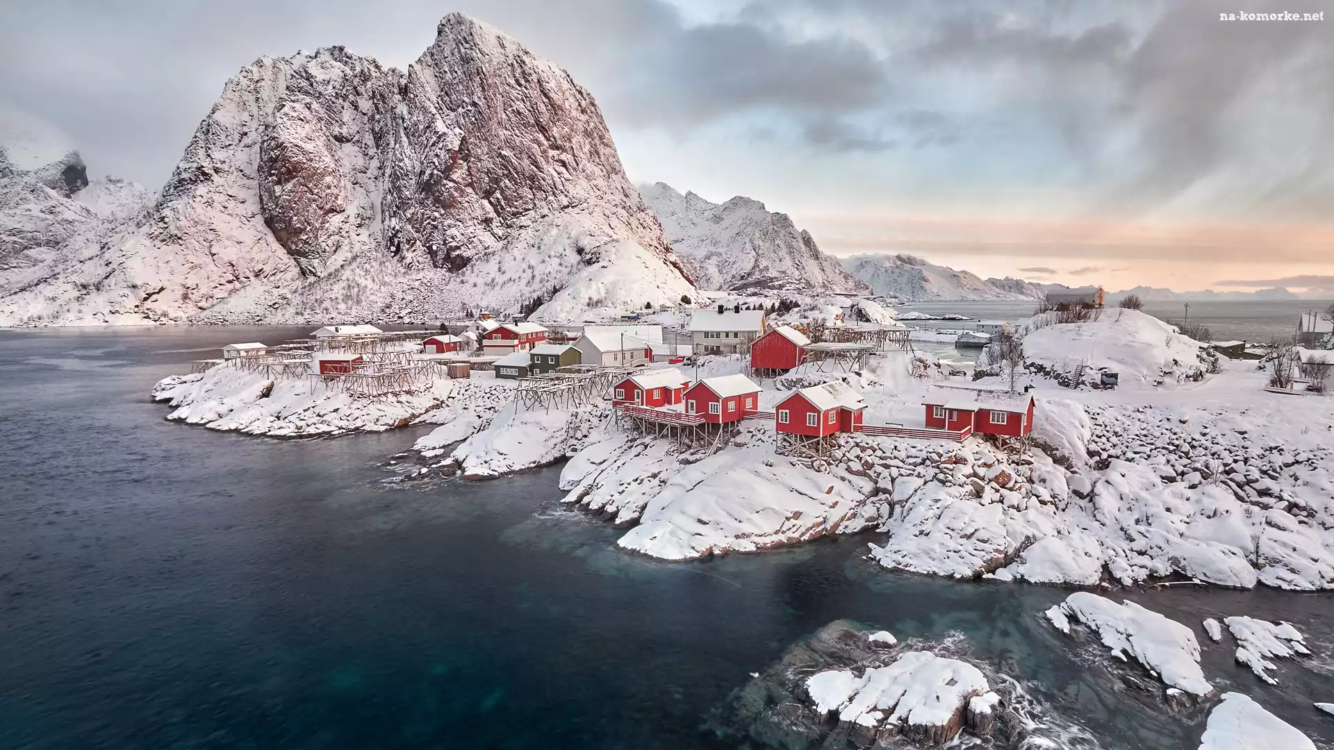 Domy, Lofoty, Norwegia, Zima, Chmury, Góry na Komórkę