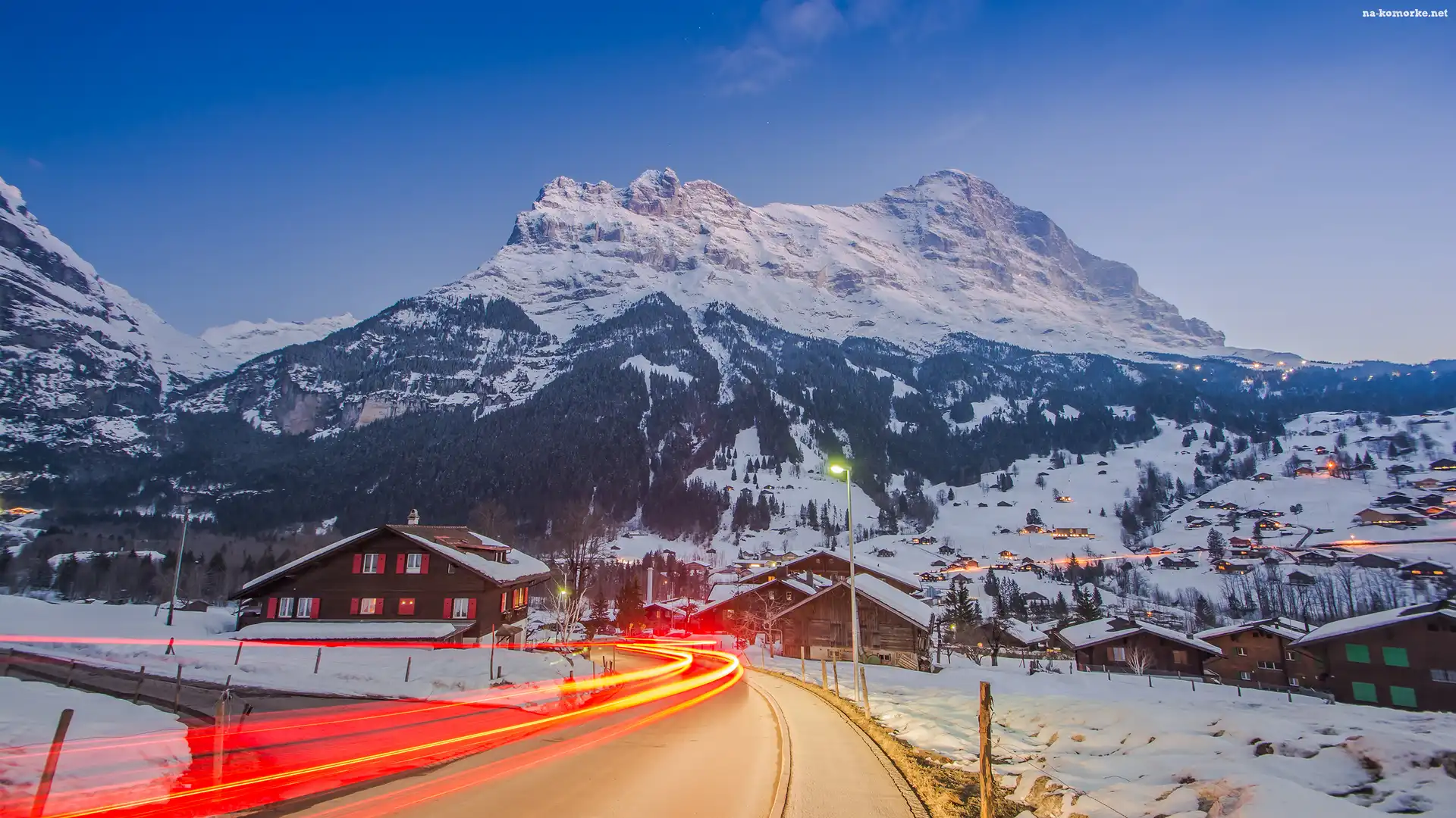 Domy, Zima, Góry, Światła, Droga, Latarnie na Komórkę