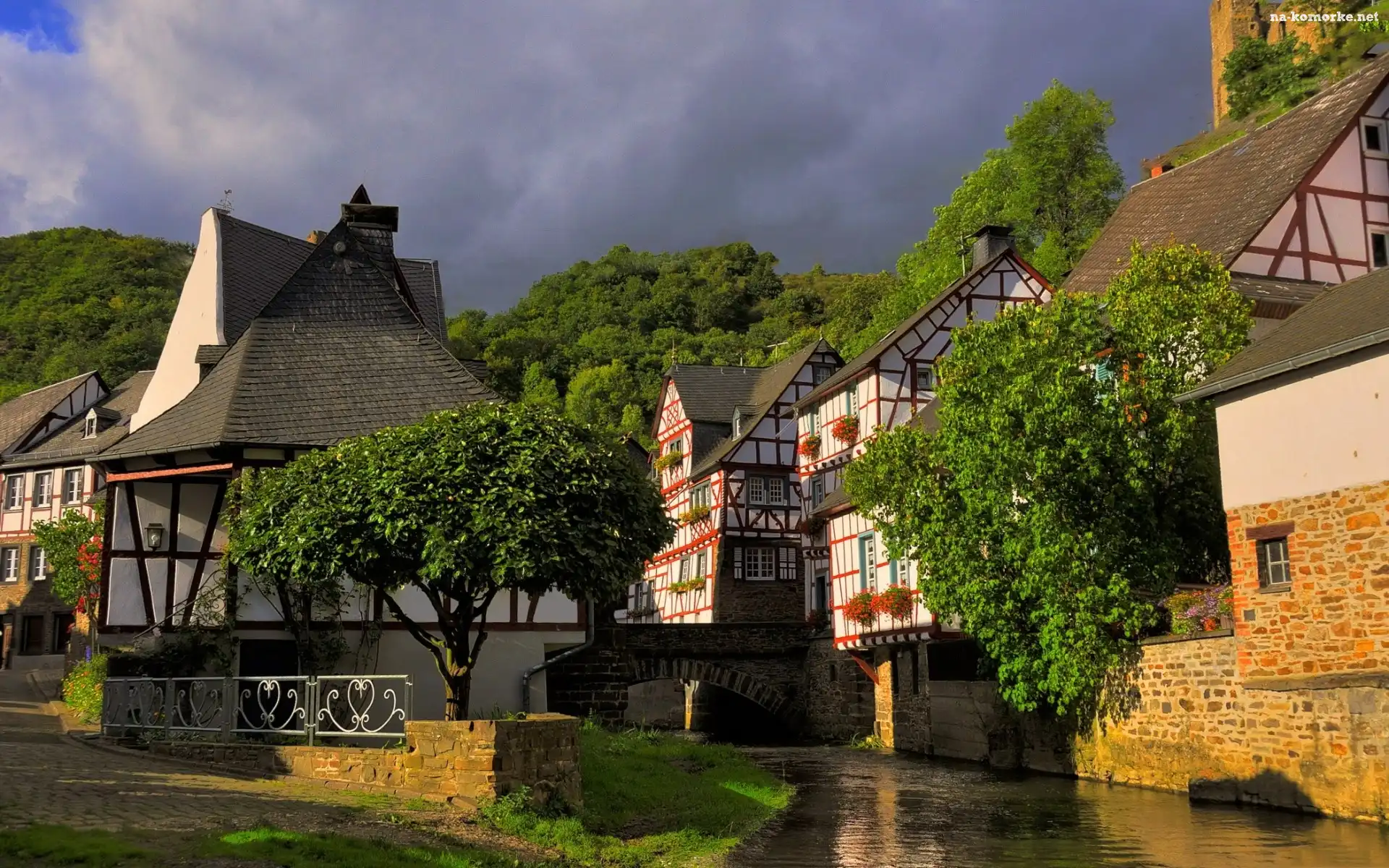 Domy, Most, Drzewa, Rzeka na Komórkę