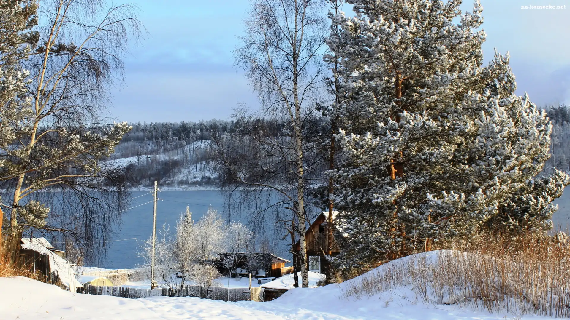 Domy, Zima, Śnieg, Drzewa, Rzeka na Komórkę