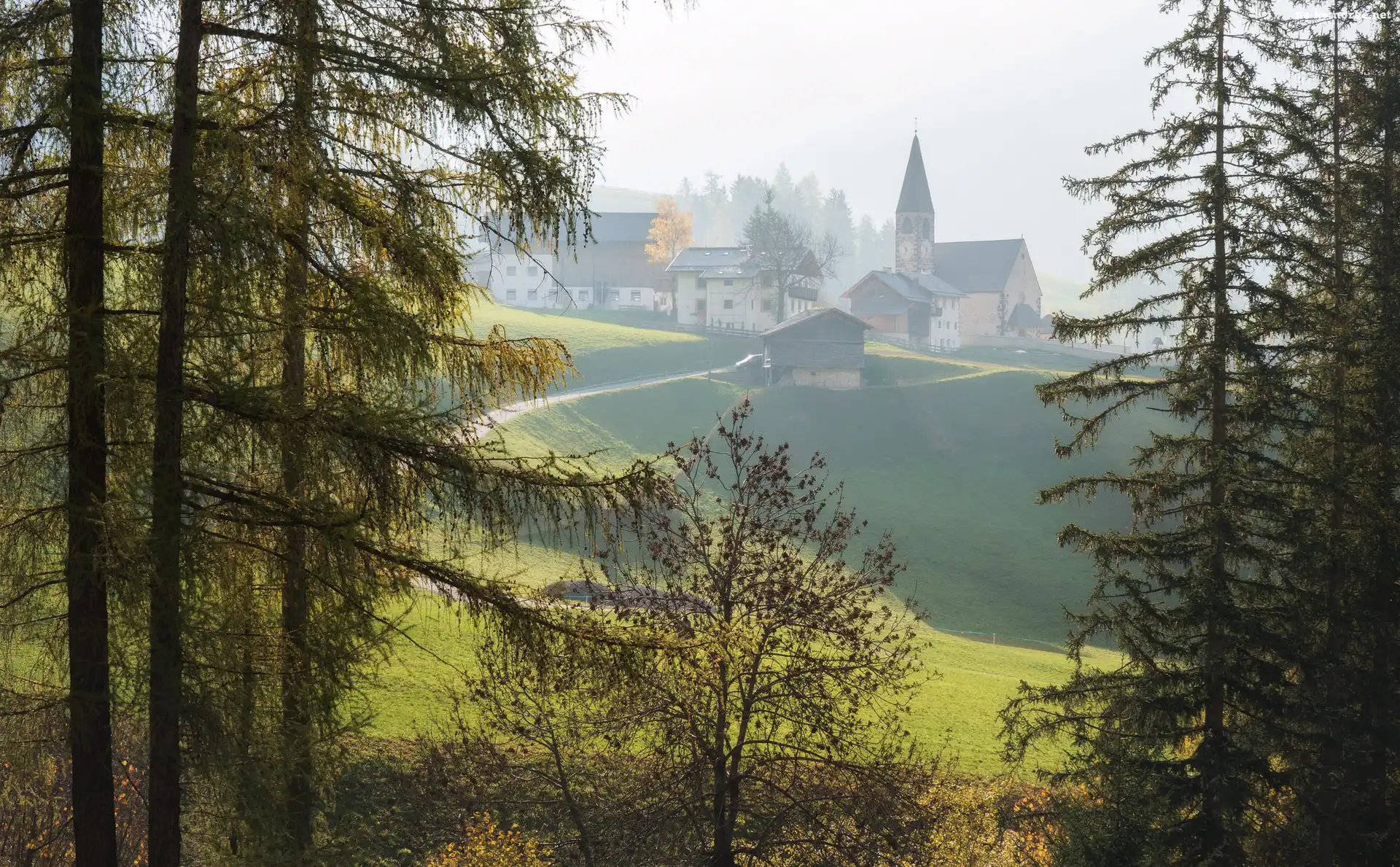 Domy, Wzgórza, Drzewa, Mgła, Kościół, Droga na Komórkę
