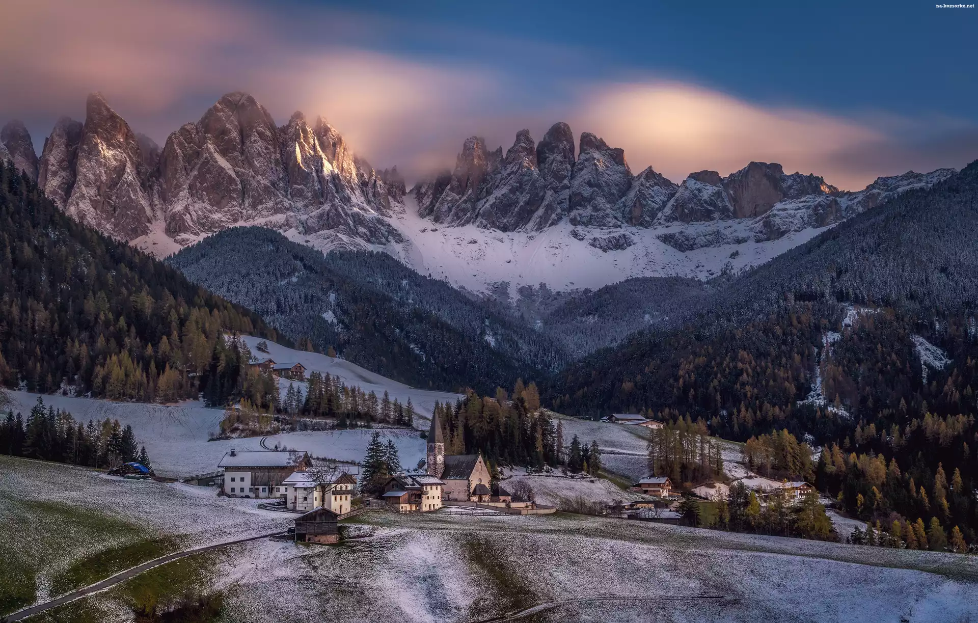 Domy, Alpy, Zima, Góry, Santa Maddalena, Dolomity, Włochy, Kościół, Las na Komórkę