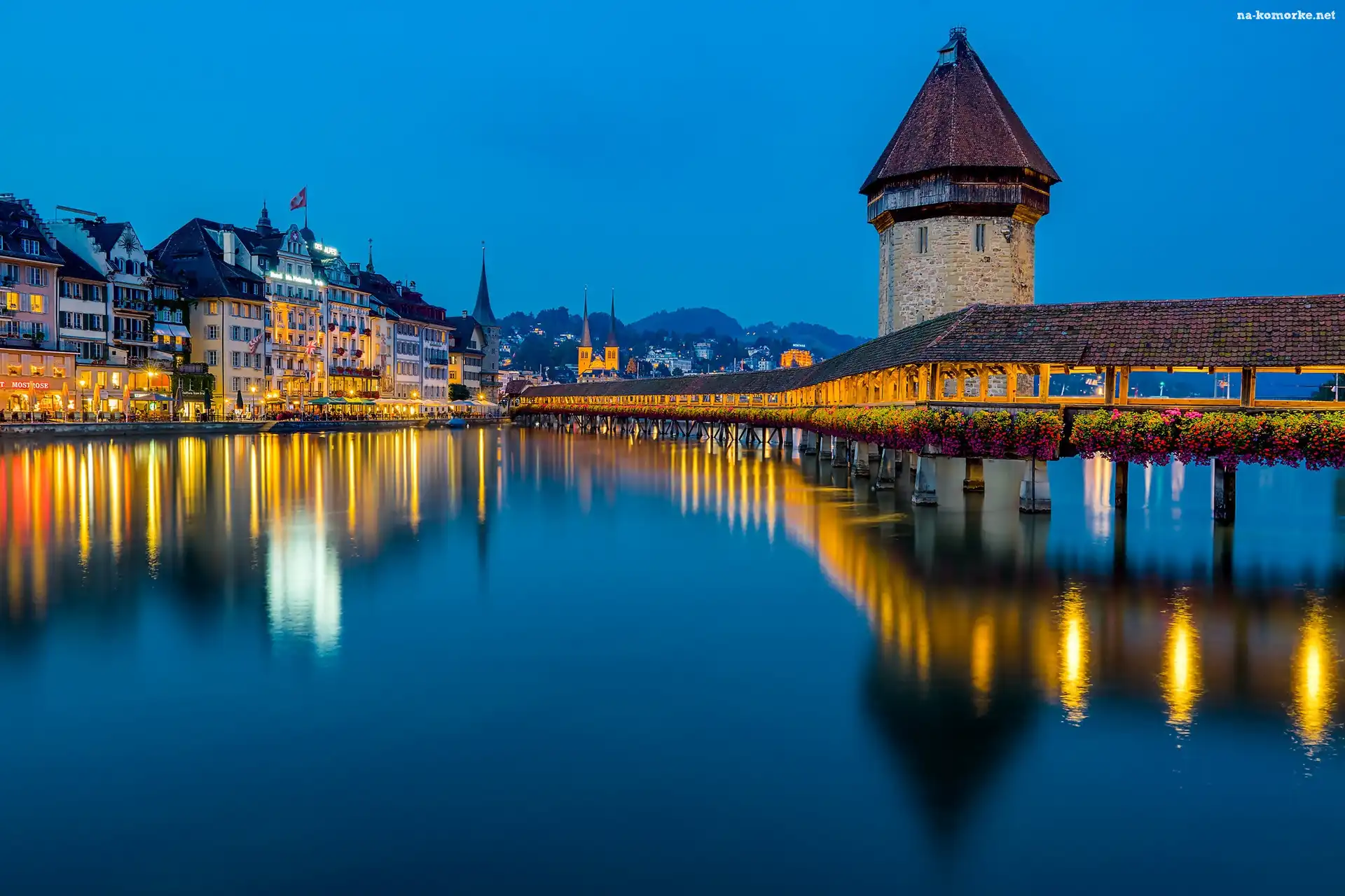 Rzeka Reuss, Lucerna, Szwajcaria, Oświetlony, Most Kapellbrucke, Wieża, Domy na Komórkę