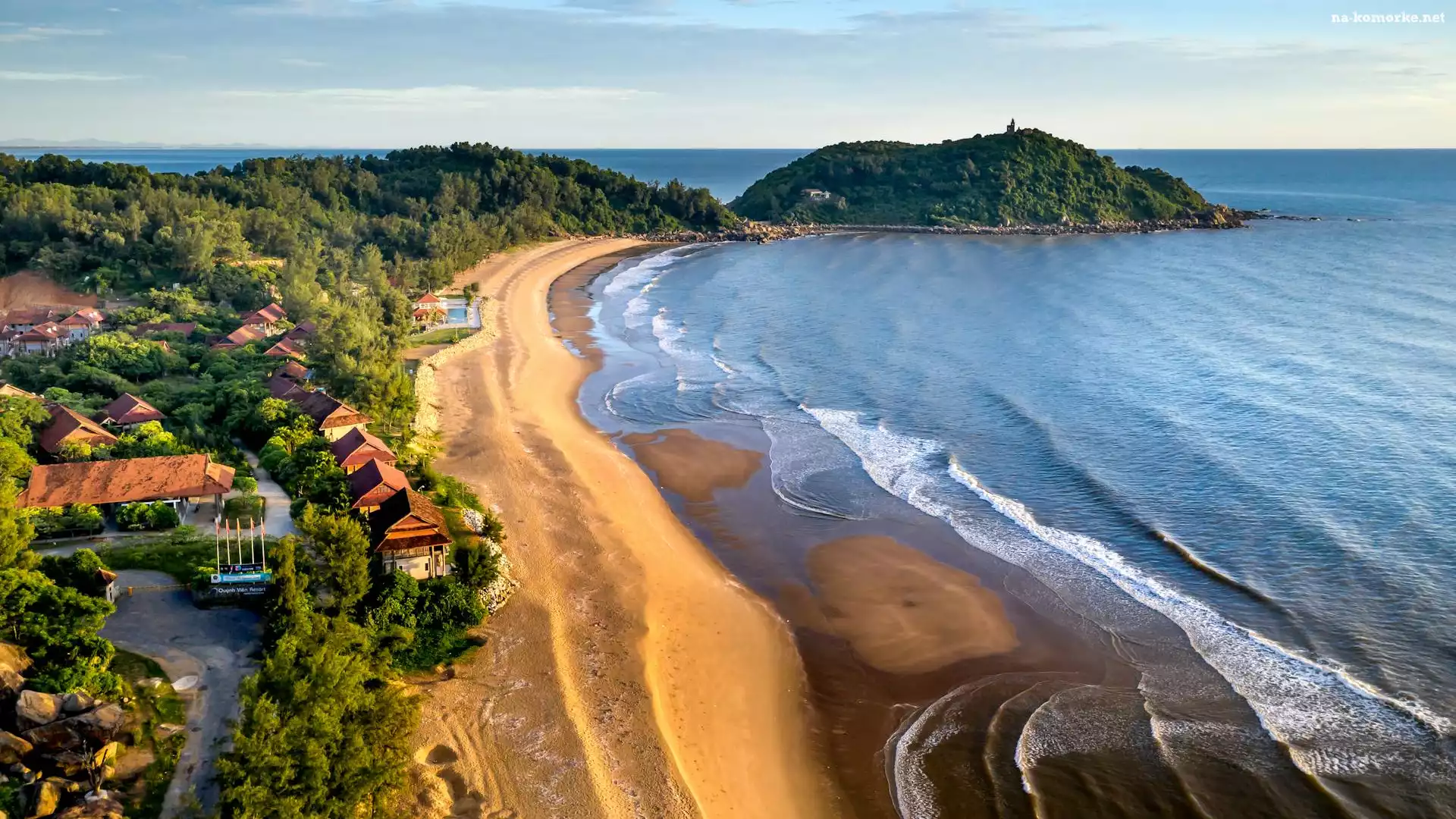 Plaża, Drzewa, Morze, Domy, Z lotu ptaka na Komórkę