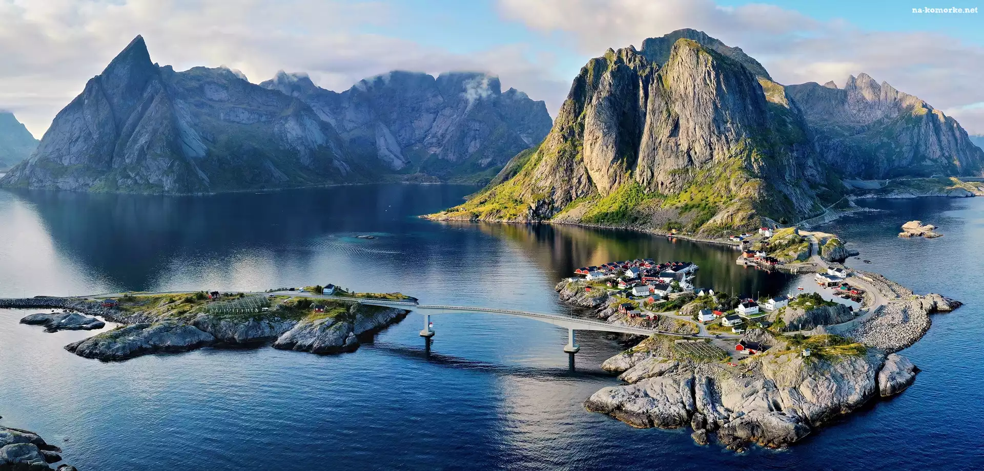 Wioski, Norwegia, Lofoty, Domy, Góry, Morze na Komórkę