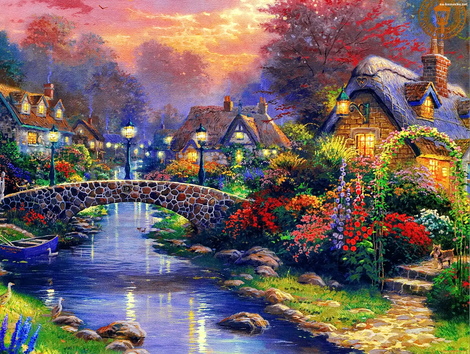 Domy, Kwiaty, Most, Rzeka na Komórkę