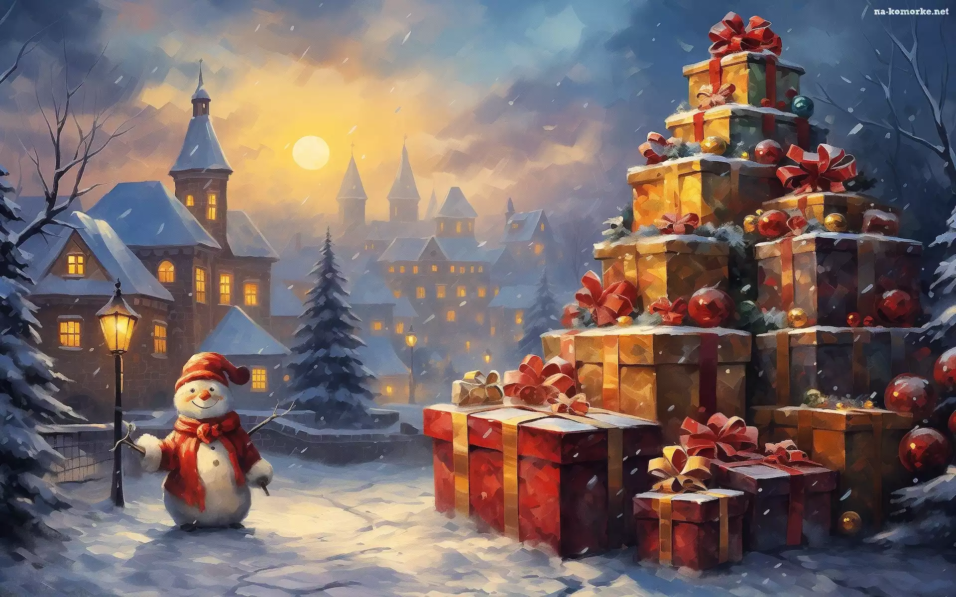 Choinka, Boże Narodzenie, Domy, Księżyc, Prezenty, Bałwan na Komórkę