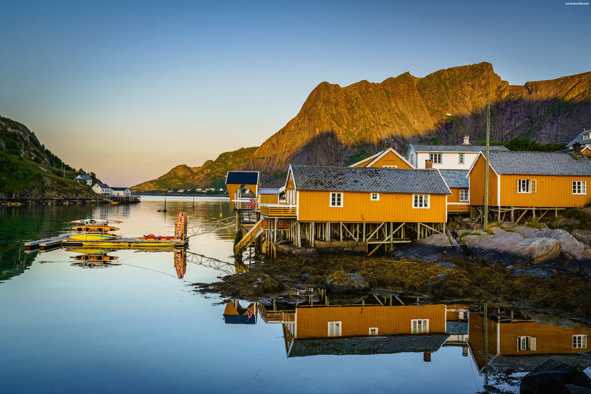 Norwegia, Morze Norweskie, Wyspa, Łódki, Lofoty, Wioska Sakrisoya, Góry, Domy na Komórkę