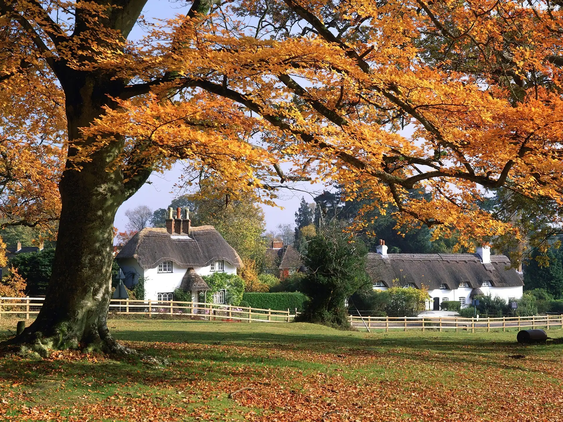 Domy, Duże, Drzewo, Żółte, Liście na Komórkę
