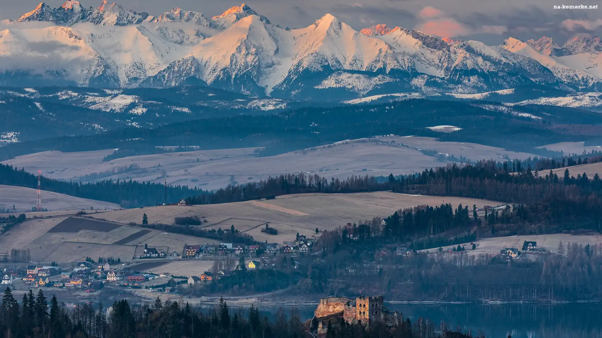 Ośnieżone, Domy, Zamek, Góry, Drzewa, Pola, Osada na Komórkę