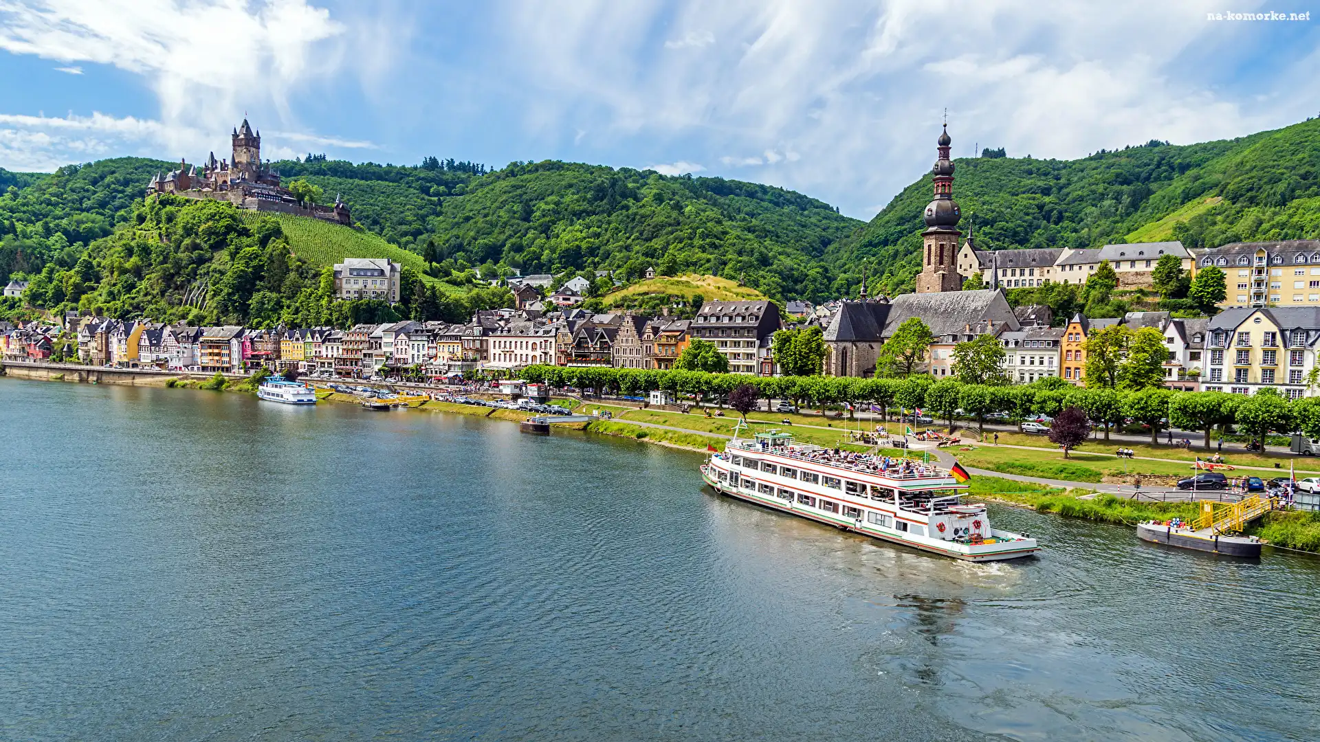 Rzeka Mozela, Domy, Zamek Reichsburg, Statek, Wzgórza, Kościół, Miasto Cochem, Niemcy na Komórkę