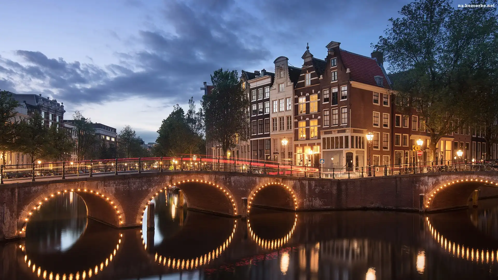 Holandia, Światła, Rzeka Amstel, Chmury, Amsterdam, Most, Drzewa, Domy na Komórkę