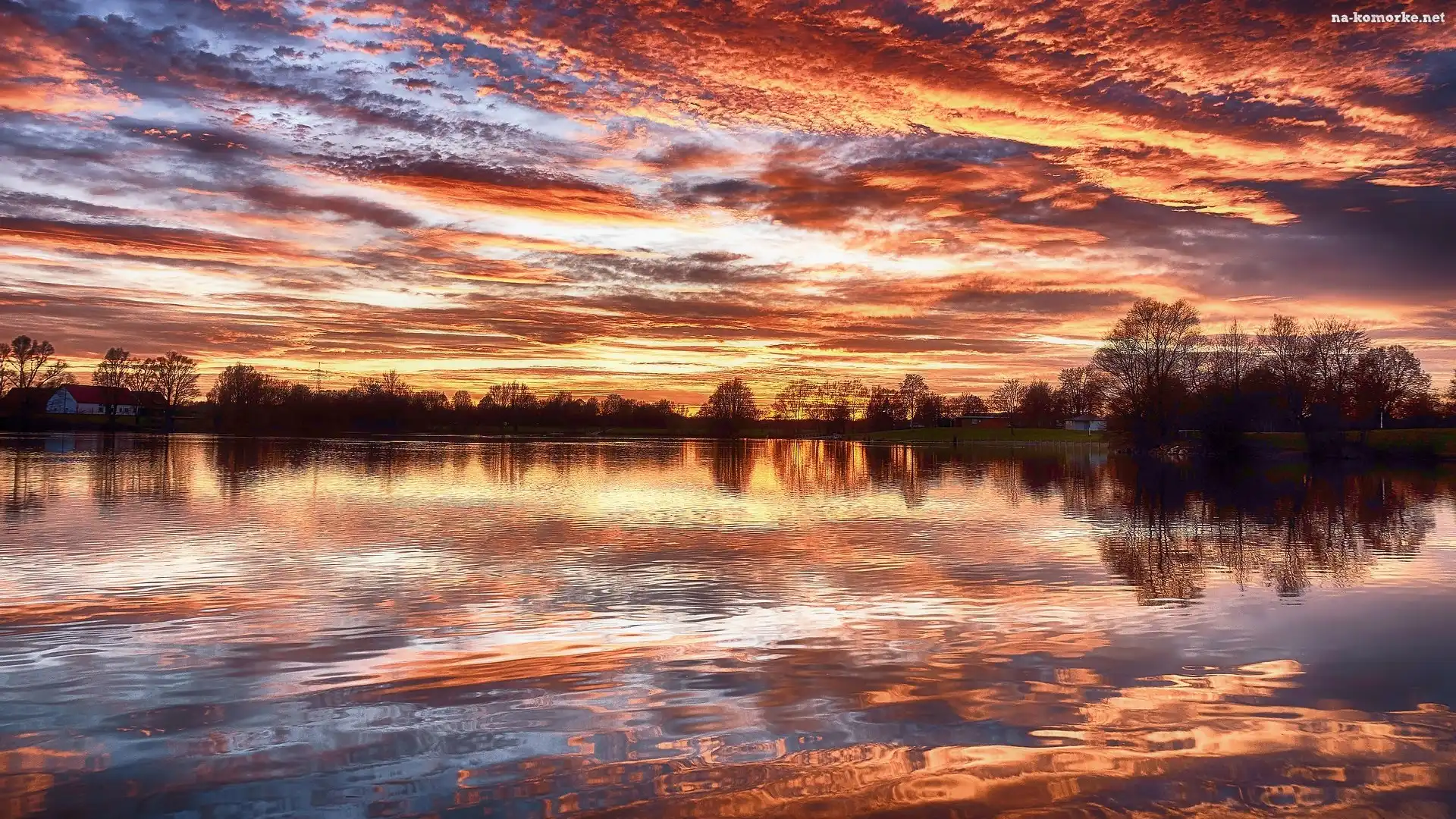 Domy, Chmury, Niebo, Jezioro, Odbicie, Zachód słońca, Kolorowe, Drzewa na Komórkę