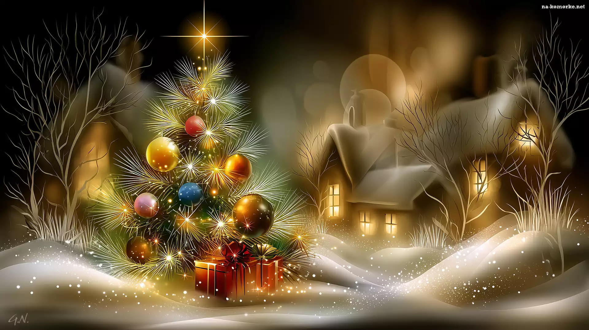 Domy, Bombki, Noc, Boże Narodzenie, Prezenty, Grafika AI, Śnieg, Choinka na Komórkę