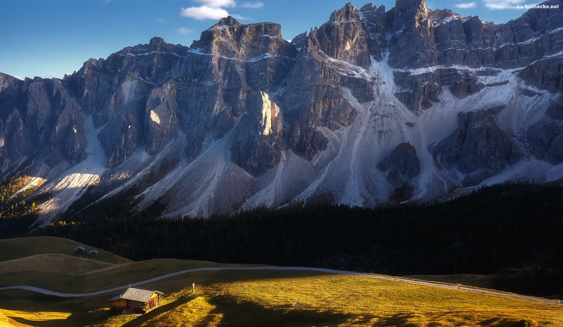 Włochy, Domy, Drzewa, Góry Alpy, Dolina, Droga, Trawa na Komórkę