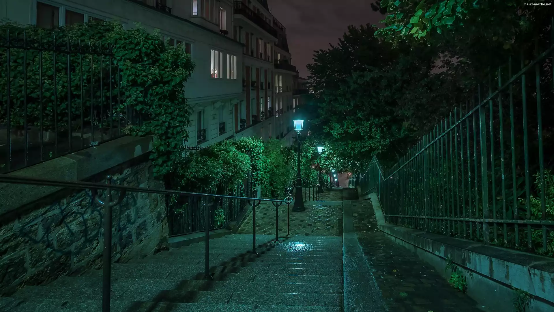 Domy, Nocą, Miasto, Latarnie, Ulica, Schody na Komórkę