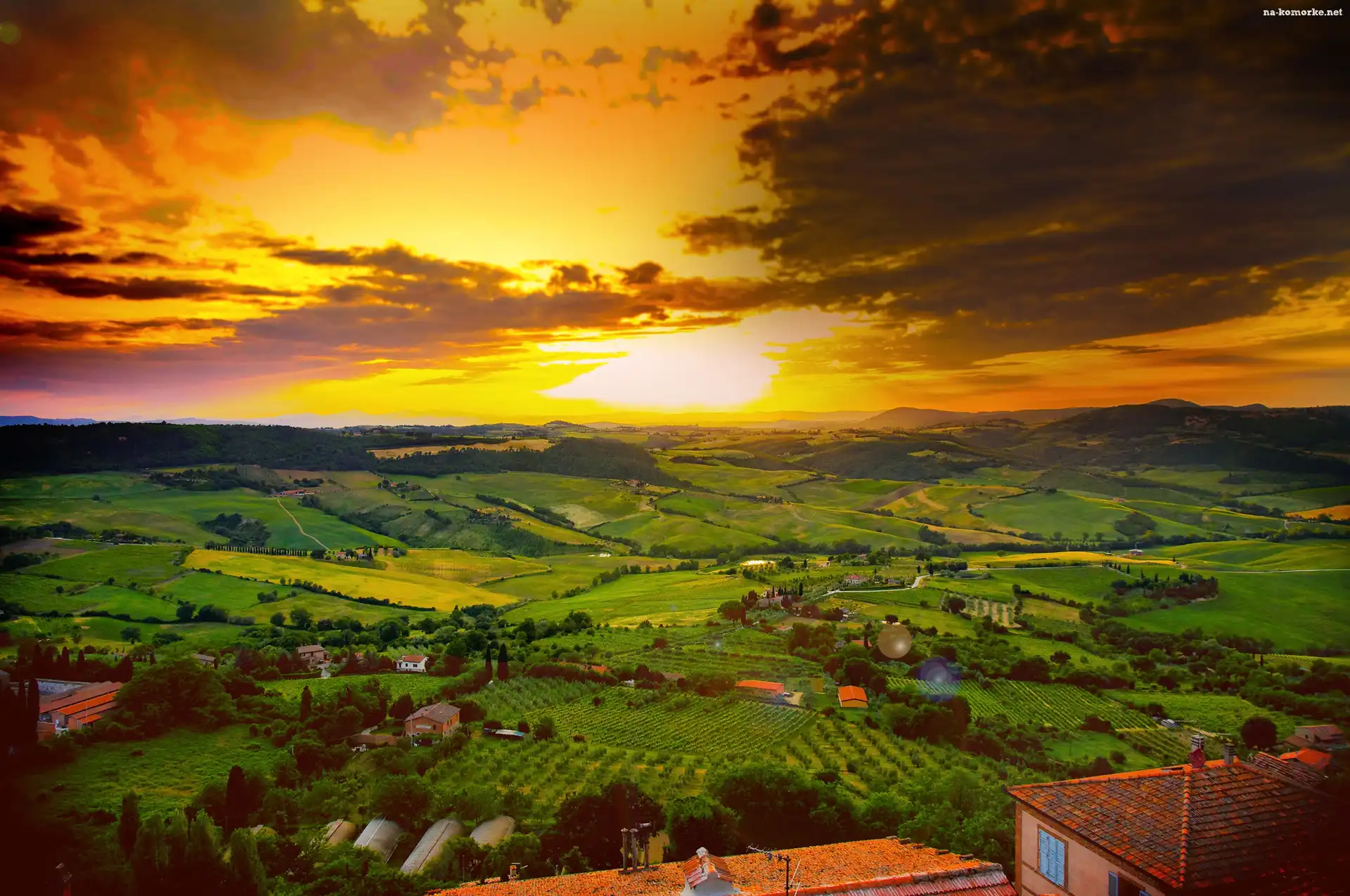 Łąki, Zachód, Słońca, Domy, Pola na Komórkę