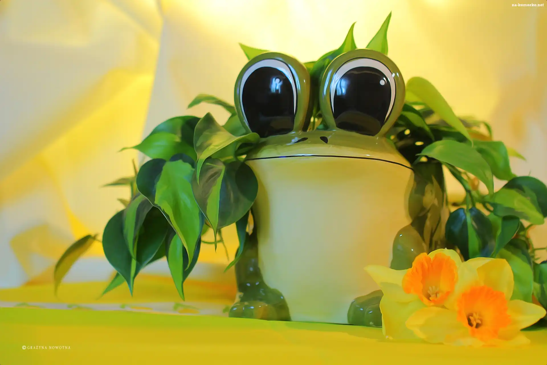 Donica, Roślina, Kwiaty, Żonkile, Żaba na Komórkę