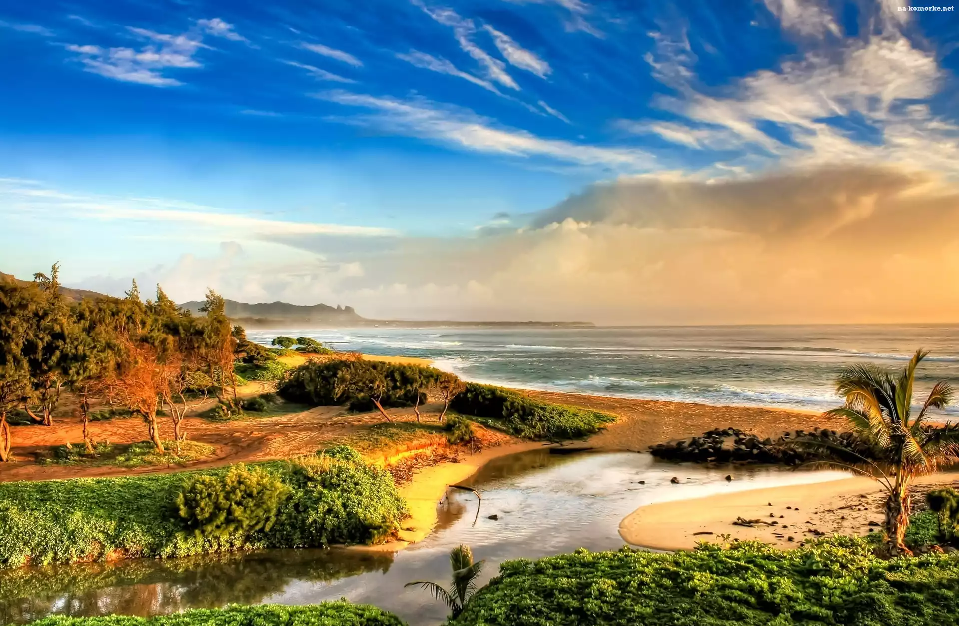 Dopływ, Morze, Drzewa, Niebo, Chmury na Komórkę