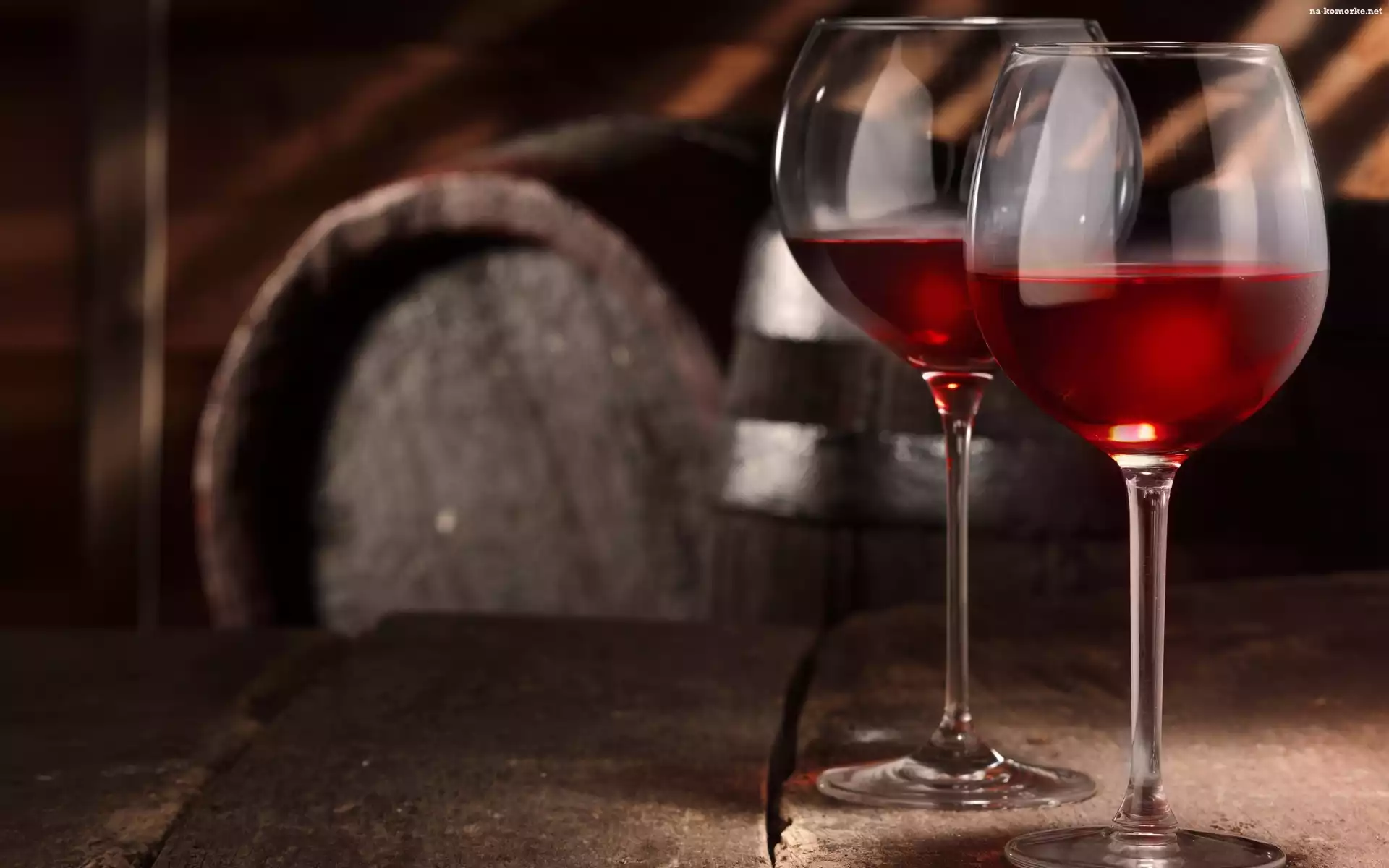 Drewniany stół, Wino, Czerwone, Kieliszki, Beczki na Komórkę