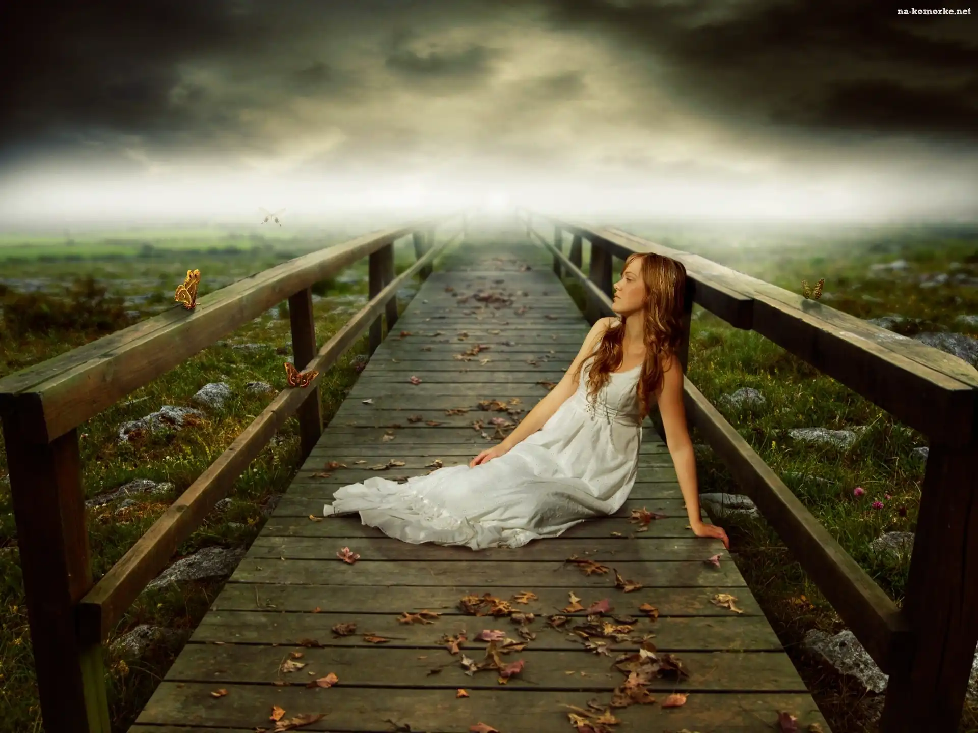 Drewniany, Smutna, Zamyślona, Mgła, Kobieta, Deptak na Komórkę