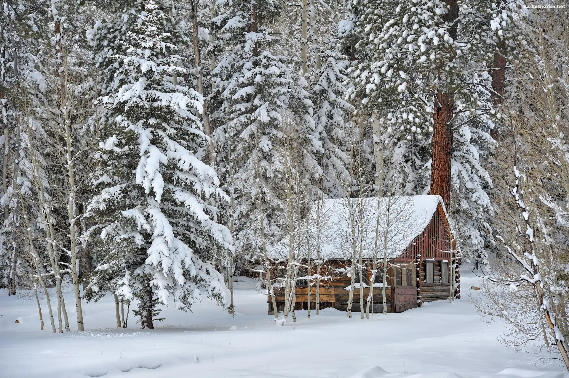 Drewniany, Drzewa, Las, Zima, Śnieg, Dom na Komórkę