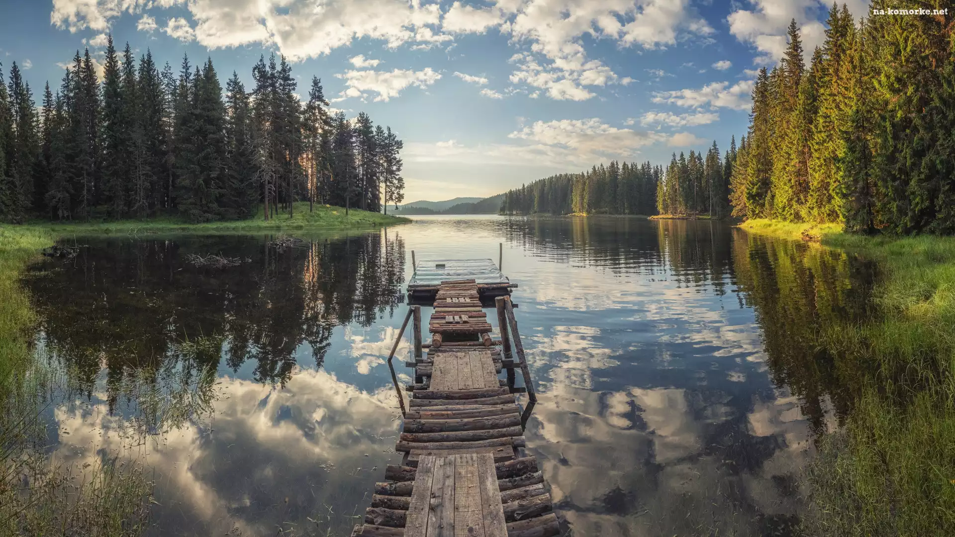 Pomost, Niebo, Odbicie, Jezioro, Las, Chmury, Drzewa, Drewniany na Komórkę