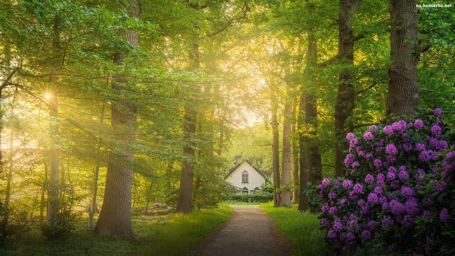 Dom, Droga, Promienie słońca, Rododendron, Drzewa, Krzew na Komórkę