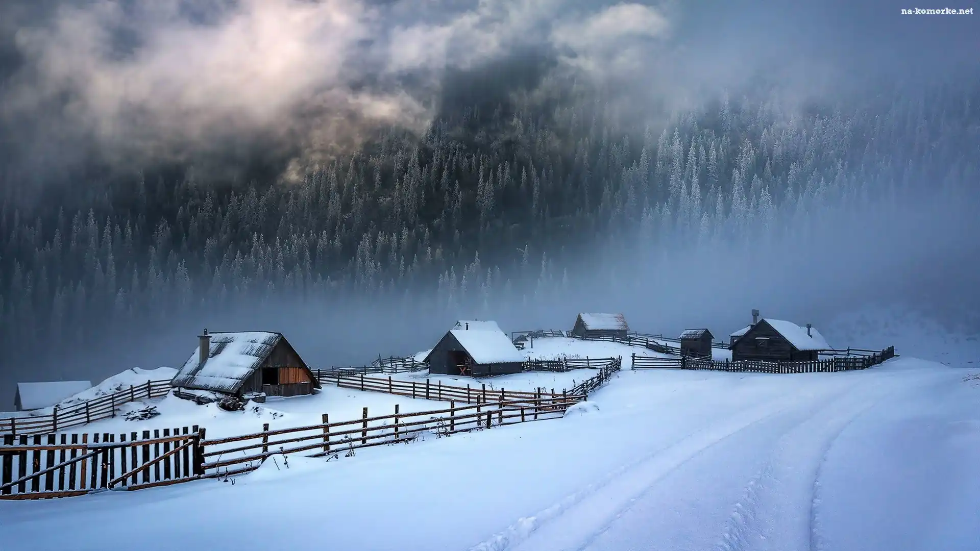 Drewniane, Droga, Zima, Zagrody, Góry, Lasy, Mgła na Komórkę