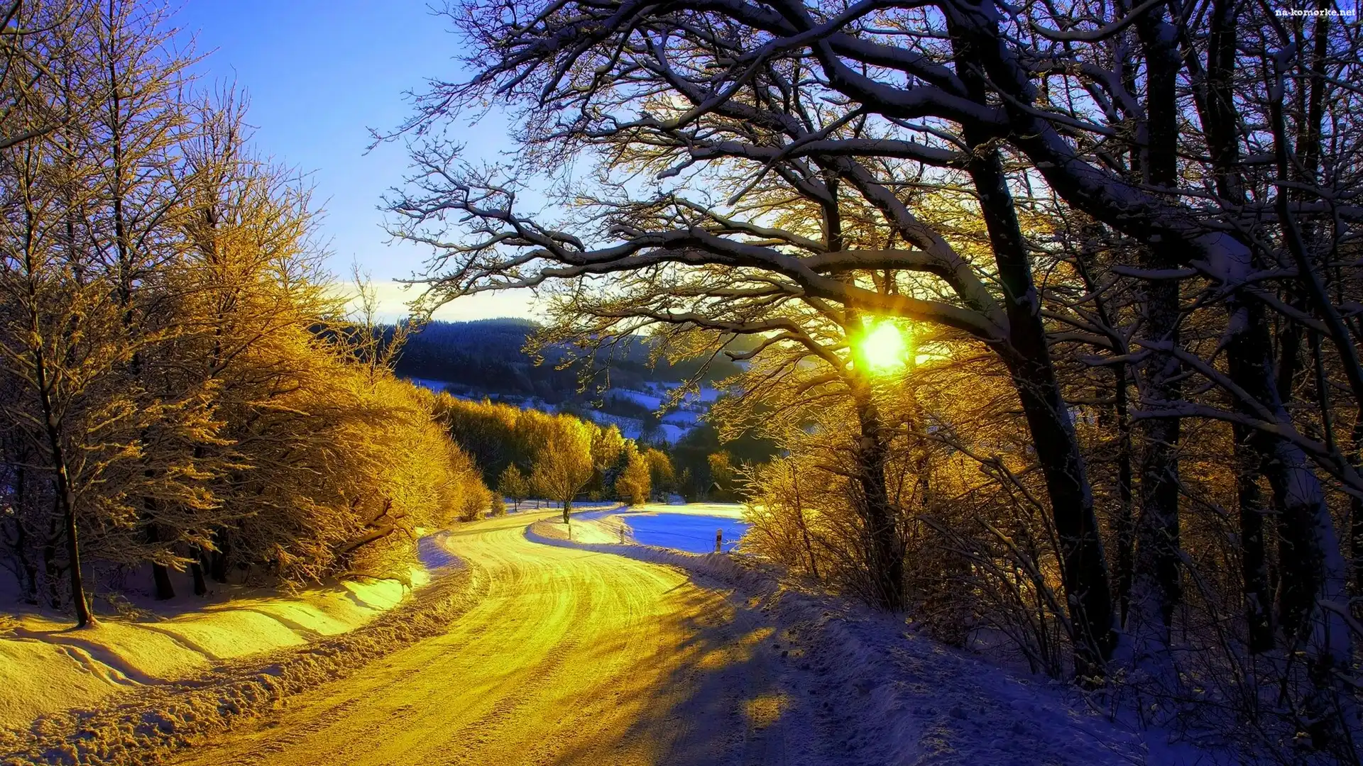 Droga, Śnieg, Drzewa, Słońce na Komórkę