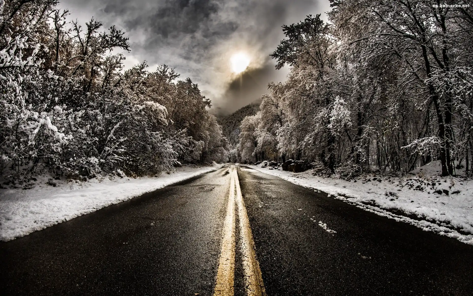 Droga, Słońce, Drzewa, Śnieg na Komórkę
