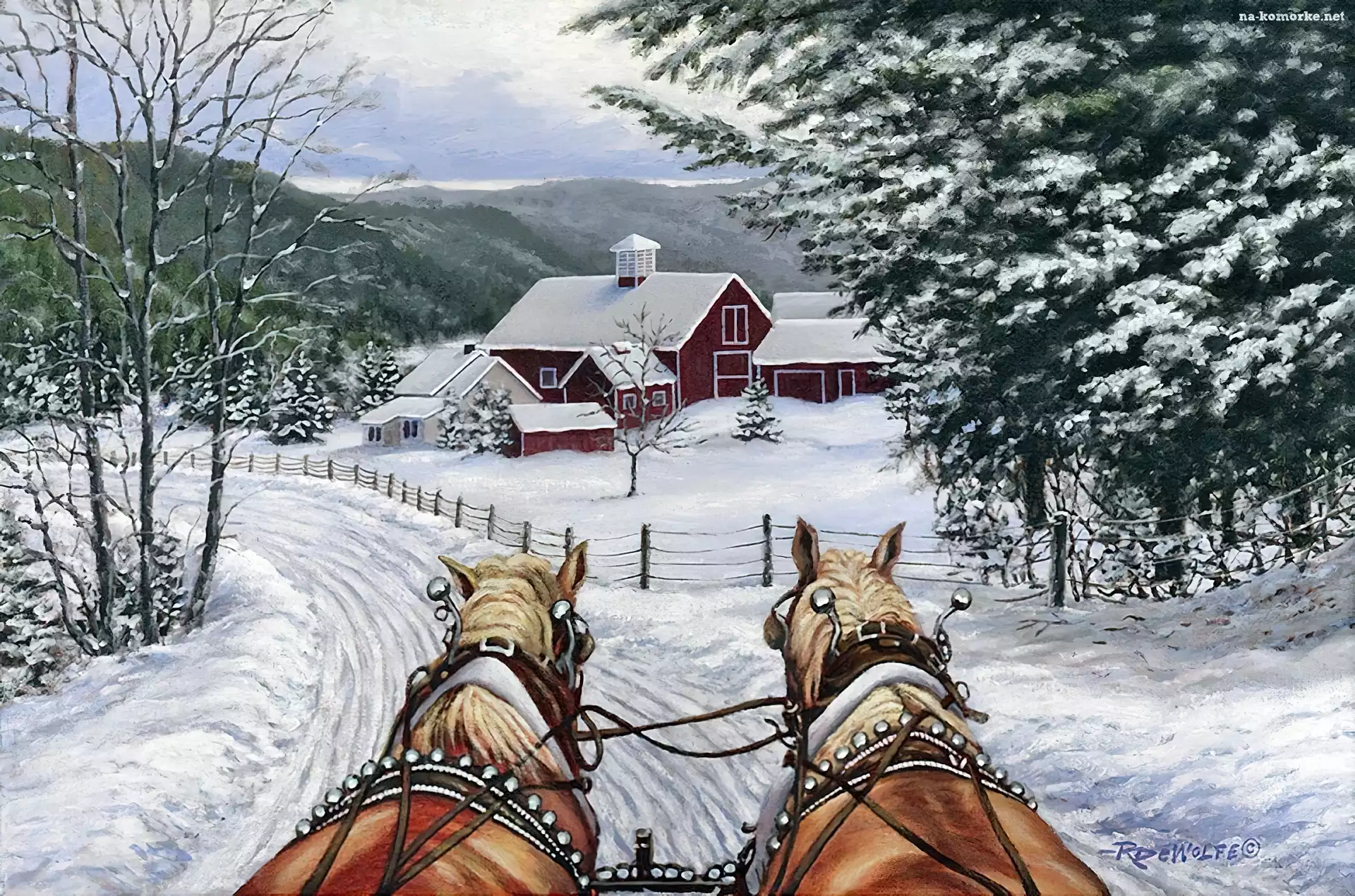 Droga, Malarstwo, Konie, Zima na Komórkę