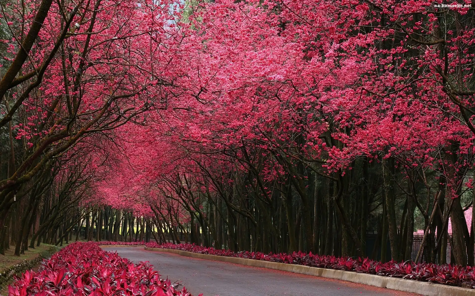 Droga, Drzewa, Kwitnące, Różowe na Komórkę